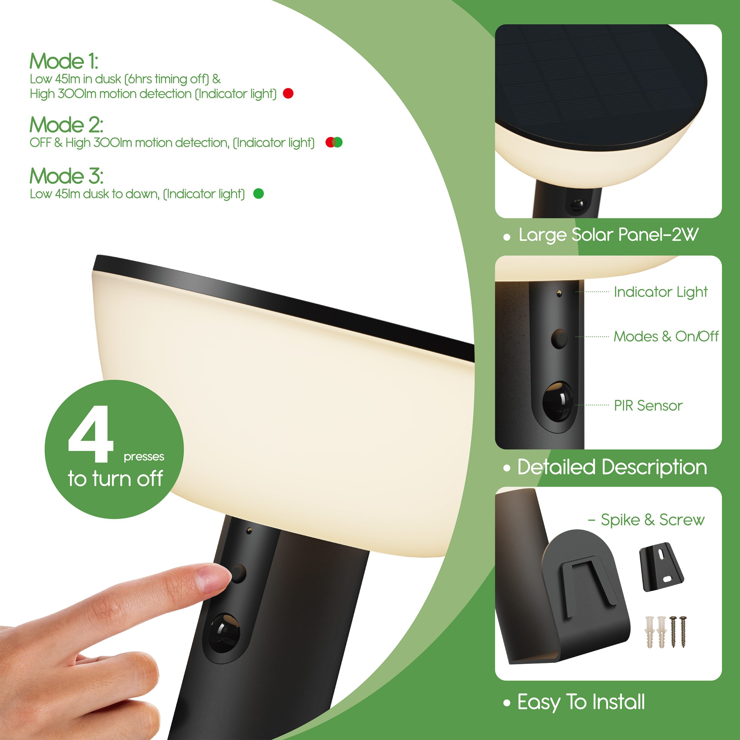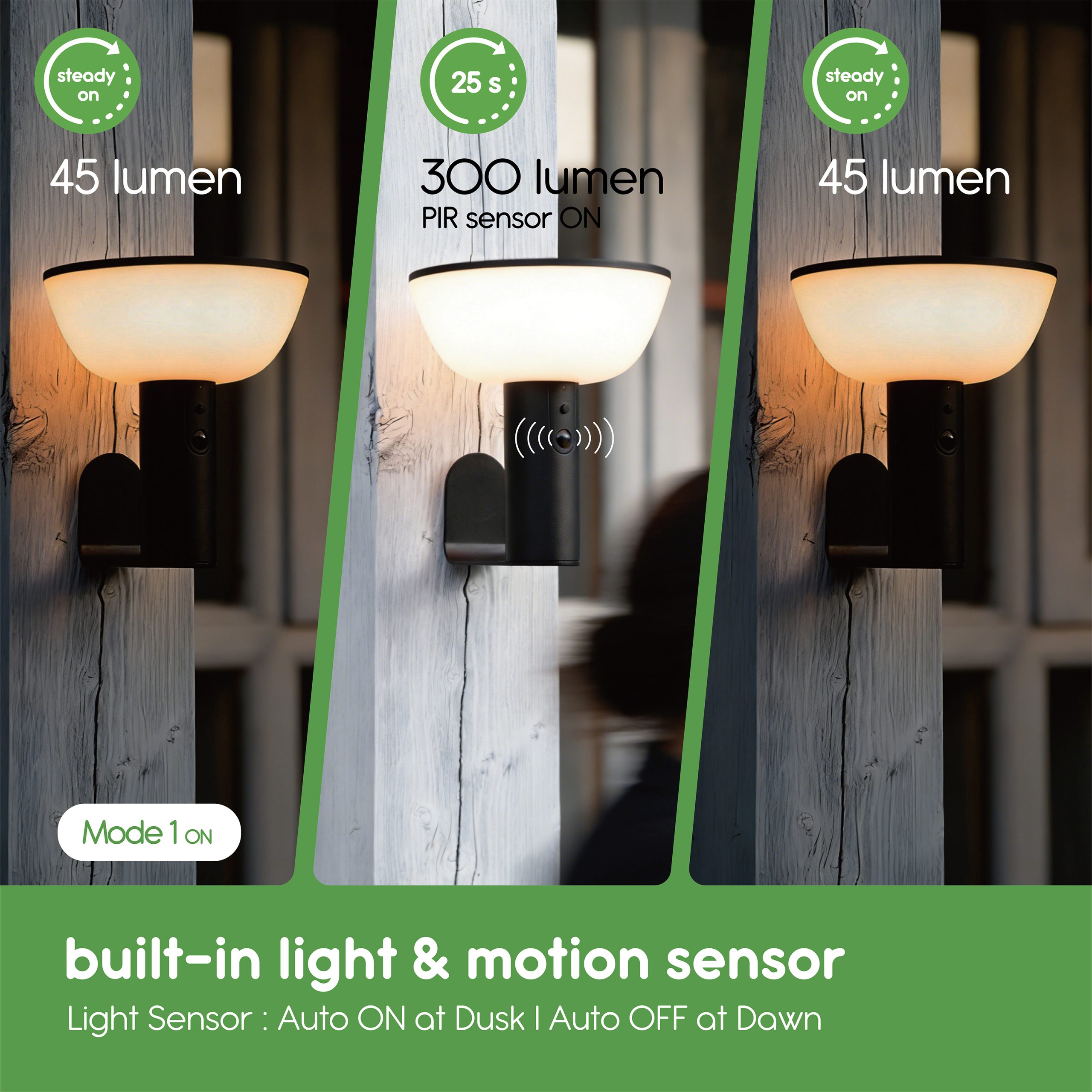 • 3 LIGHT MODES:  1) Constant Soft Lighting  |  2) Low-To-Bright Motion Activation | 3) Motion Activation Only