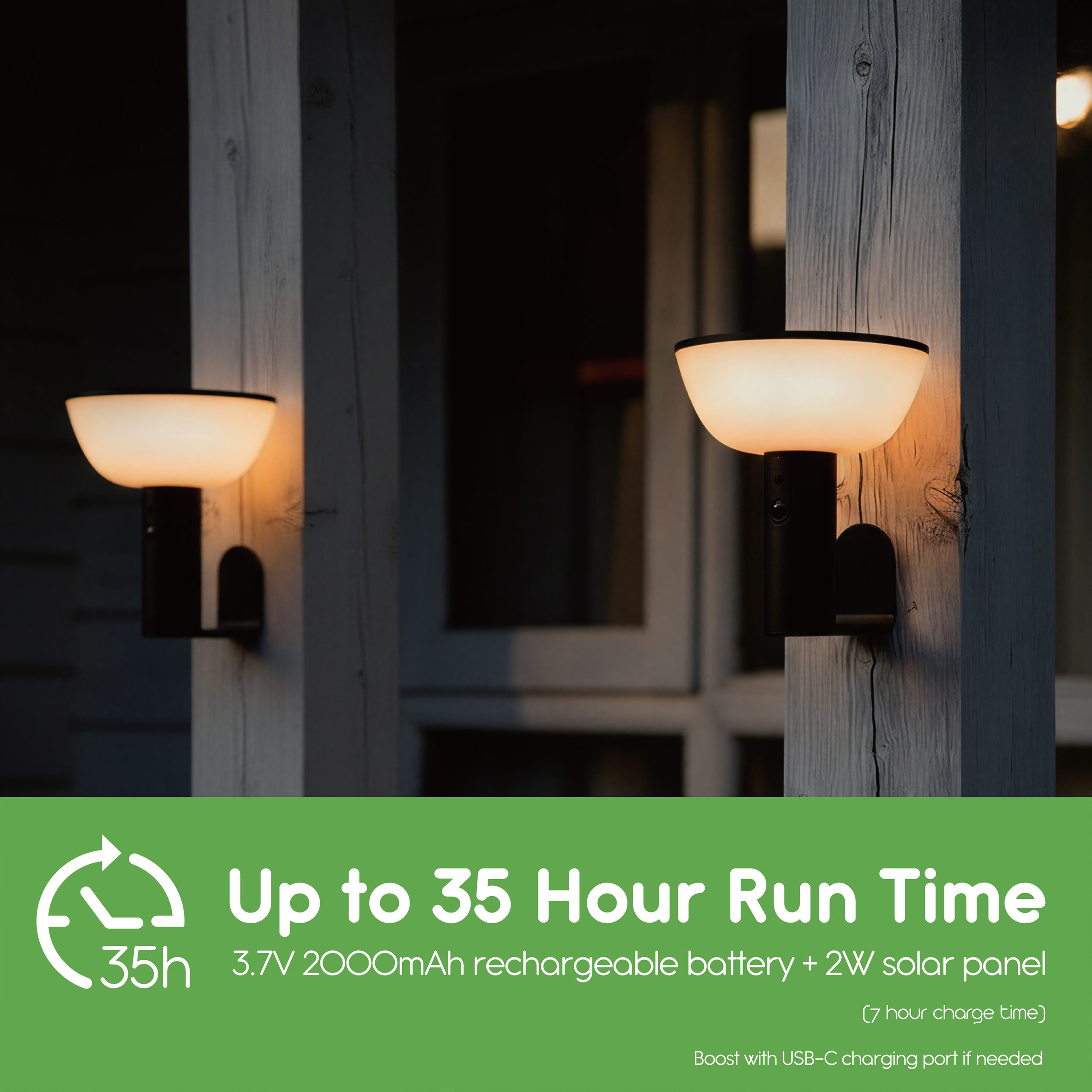 • 2W SOLAR CHARGING PANEL + 2000 mAh LI-ION BATTERY:  Up to 35 hours of lighting when fully charged