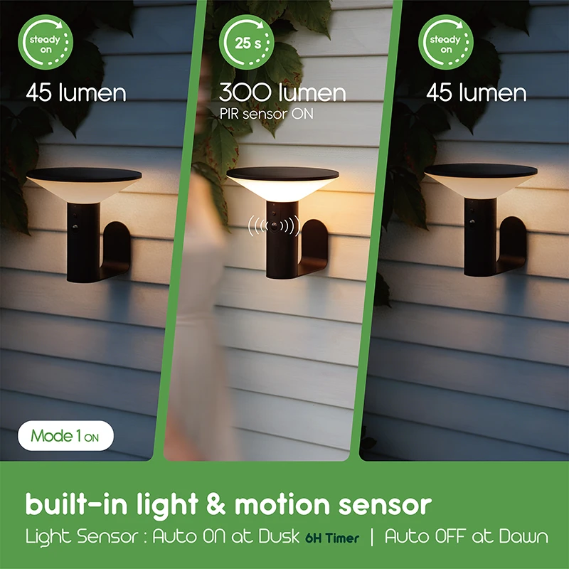 - Mode 1: Soft 45-lumen glow at dusk, brightening to 300 lumens for 25 seconds when movement is detected, then returning to the dim setting.