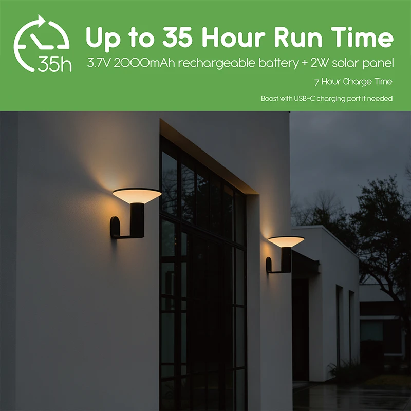 This smart design conserves battery power while enhancing safety and visibility. Powered by a 2W solar panel and a rechargeable 3.7V 2000 mAh battery, each light can last up to 35 hours on a full charge—even during shorter winter days. The USB-C charging port allows quick recharging when sunlight is limited, so you can rely on them even in cloudy or rainy weather. Made with IP44 water-resistant materials, VerLuce Solar Wall Lights can withstand rain, snow, heat, and freezing temperatures. Installation is straightforward—no wiring required—just stake them into the ground or mount them anywhere extra light is needed. Sized at 6.3” x 6.3” x 12”, they’re perfect for walkways, gardens, patios, driveways, and decks. With VerLuce, you get energy-efficient LED and solar-powered lighting that cuts electricity costs while improving the beauty and security of your home.